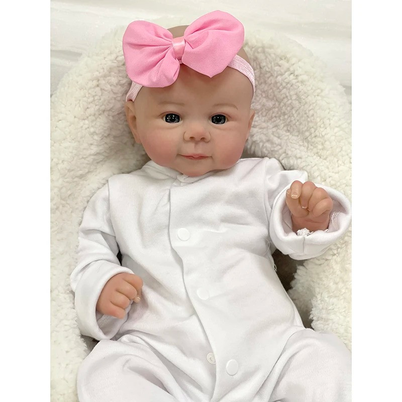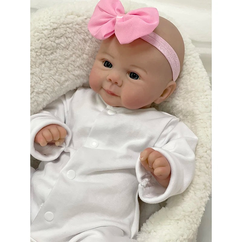 Nádherné spiace dievčatko meria 46 cm. Keď ju držíte v náruči- ako by ste držali malé bábätko.  Telo má látkové, končatiny  z vinylu.  Bábika má jemne maľované  vlasy.  Príde aj s magnetickým cumlíkom. Karolin sa hlasno smeje.