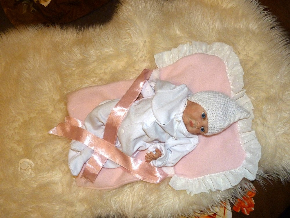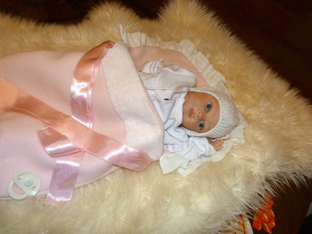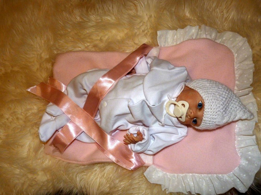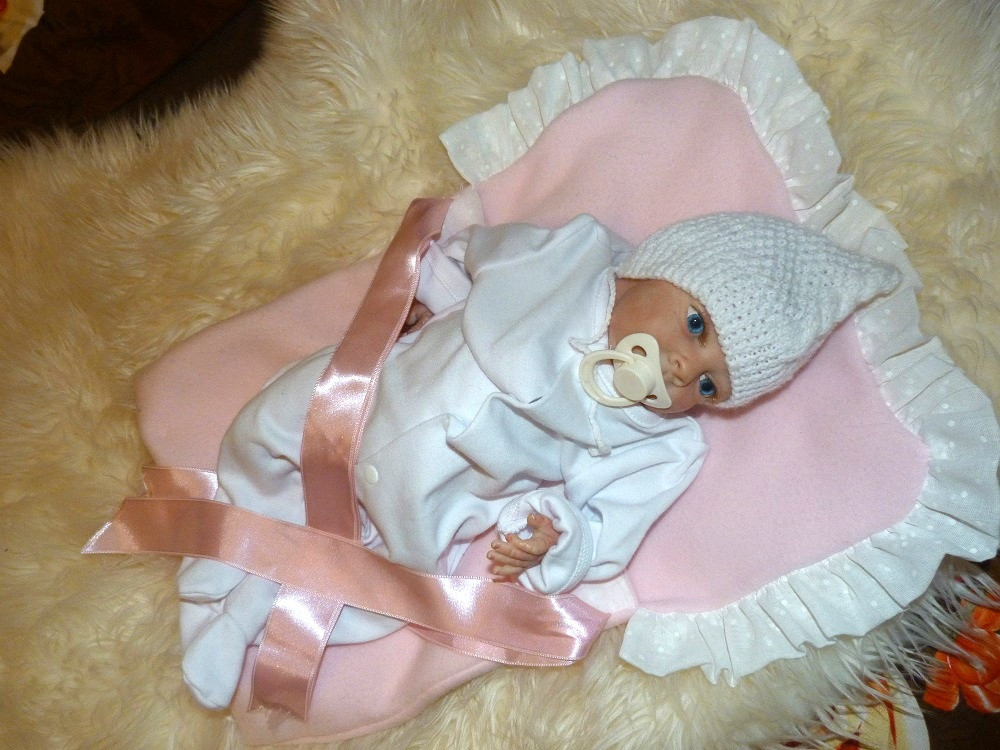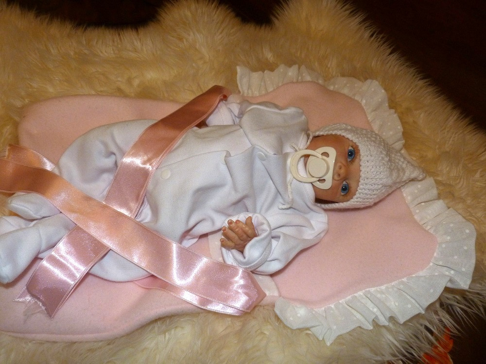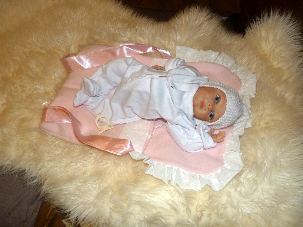 Táto drobnučká bábika meria 40 cm. Je veľmi precízne a dôkladne vyrobená.Telíčko má vyplnené granulátmi, vláknom, či vatou. Končatiny má z vinylu. Na tváričke vidno všetky detaily. Vlásky ma jemne maľované.