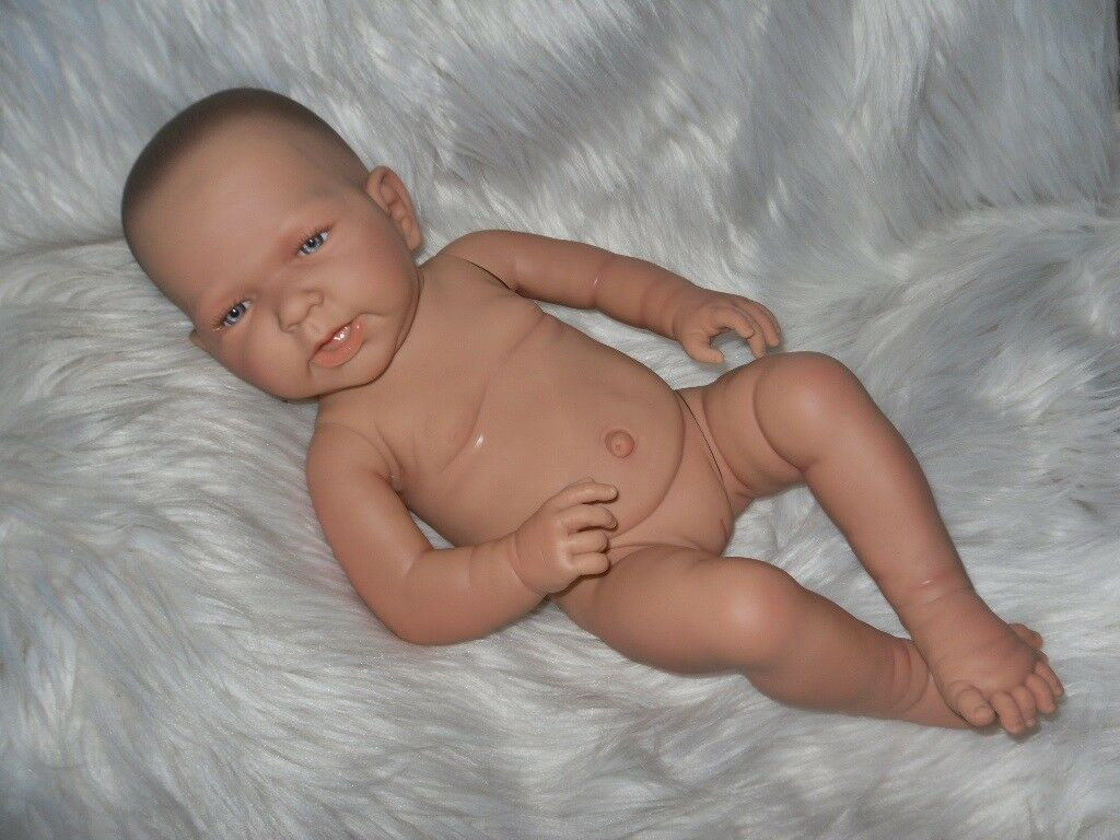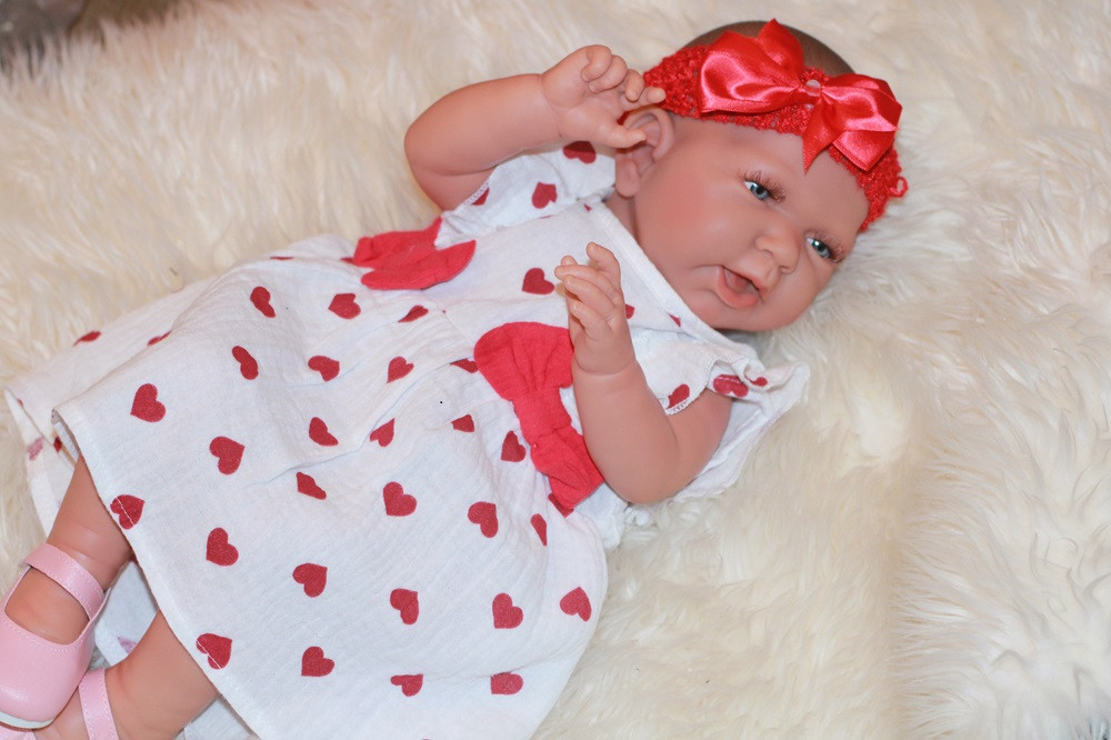 Dievčatko má celé telíčko z vinylu. Vlásky nemá. Má nádherne modré očká. S hlavičkou sa dá otáčať, a ľahko sa pracuje aj s rukami a nohami. Meria 54 cm. Bábika príde aj s cumlíkom.