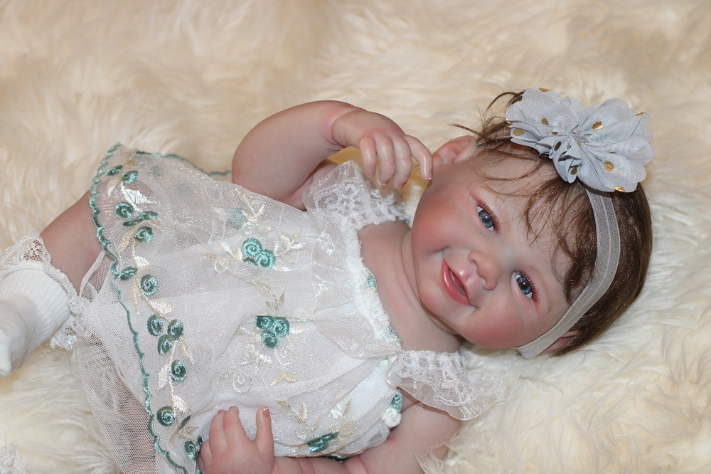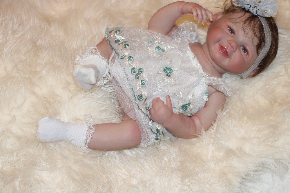 Nádherná bábika  meria 46 cm. Keď ju držíte v náruči- ako by ste držali malé bábätko.  Telo má celé  z vinylu.  Bábika má vpichované vlasy.  Príde aj s magnetickým cumlíkom.