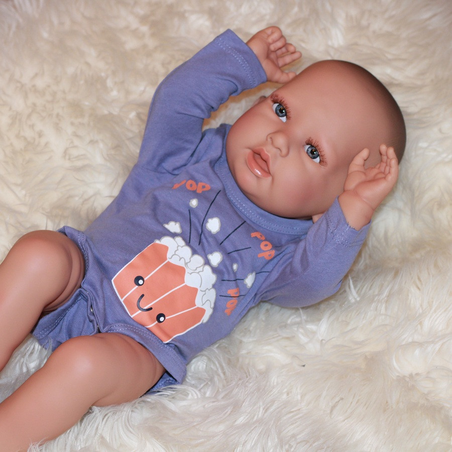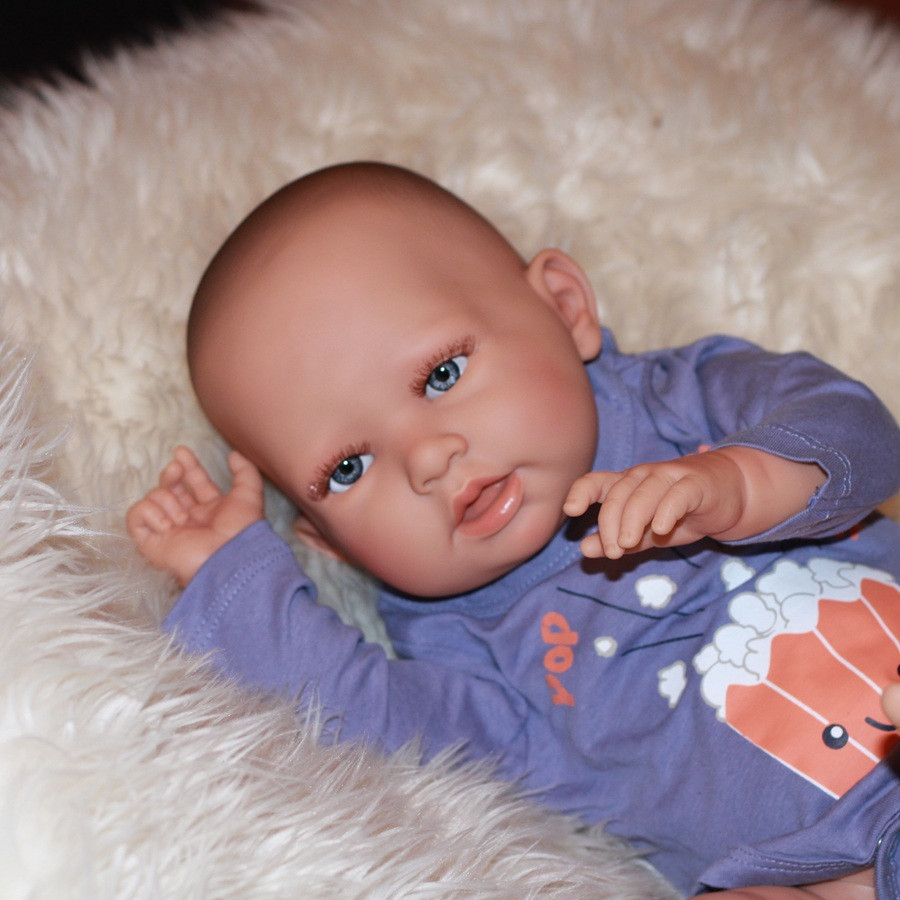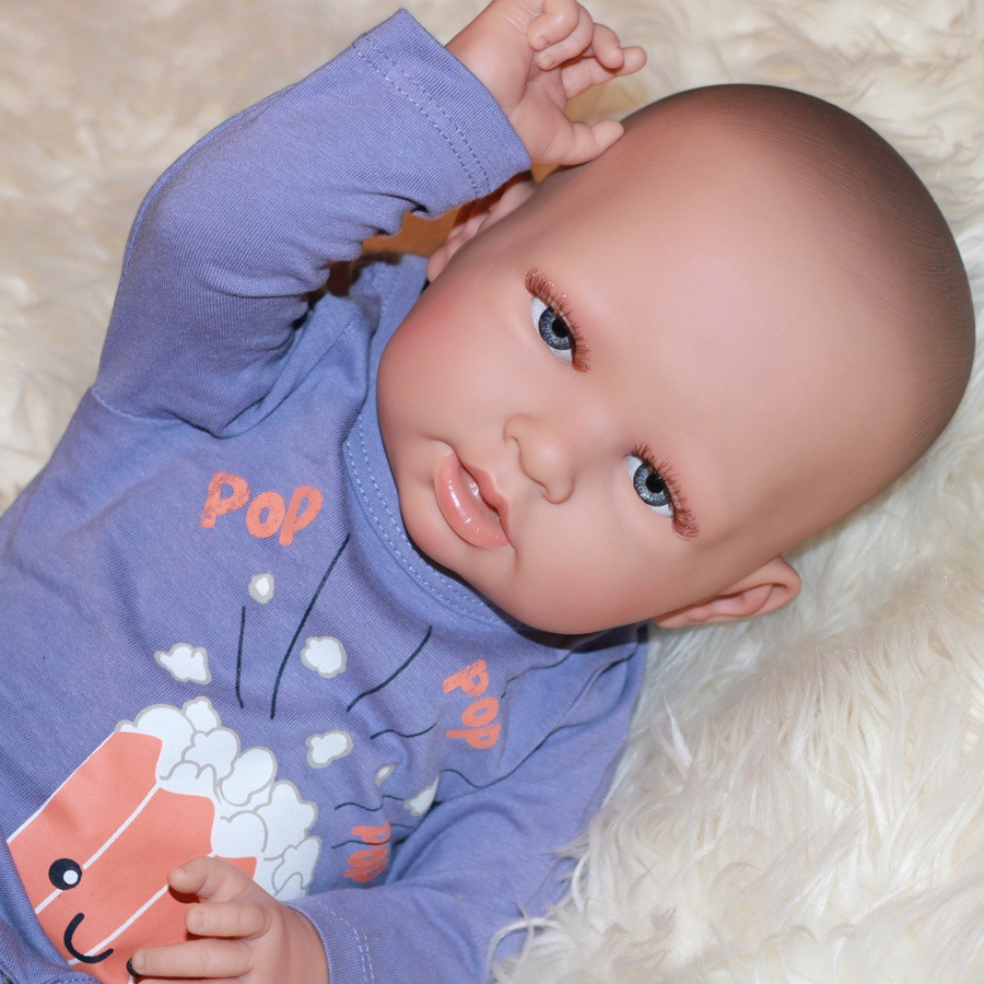 Chlapček má celé telo z vinylu. Vlásky nemá. Má nádherne modré očká. S hlavičkou sa dá otáčať, a ľahko sa pracuje aj s rukami a nohami. Meria 52 cm. Bábika príde aj s cumlíkom.
