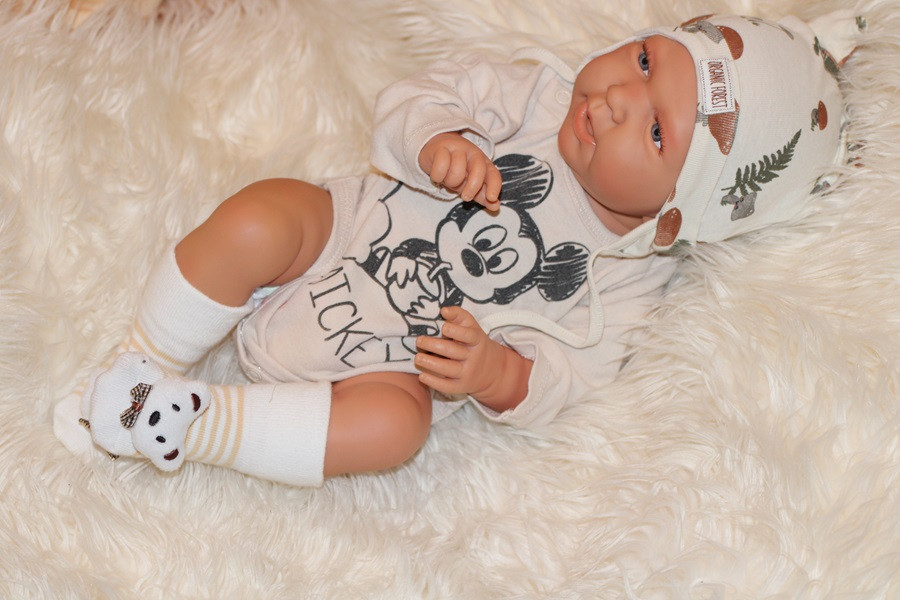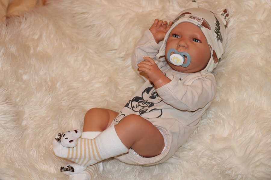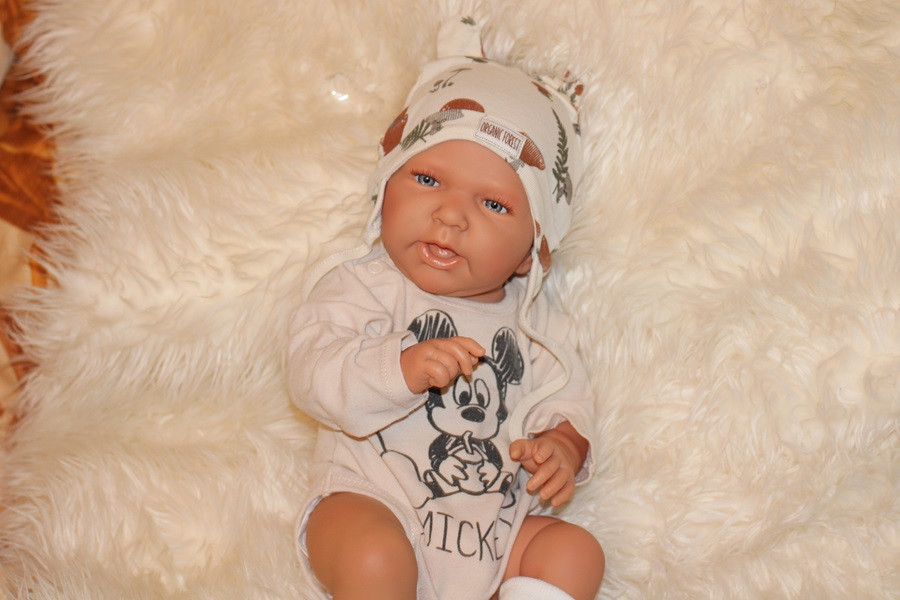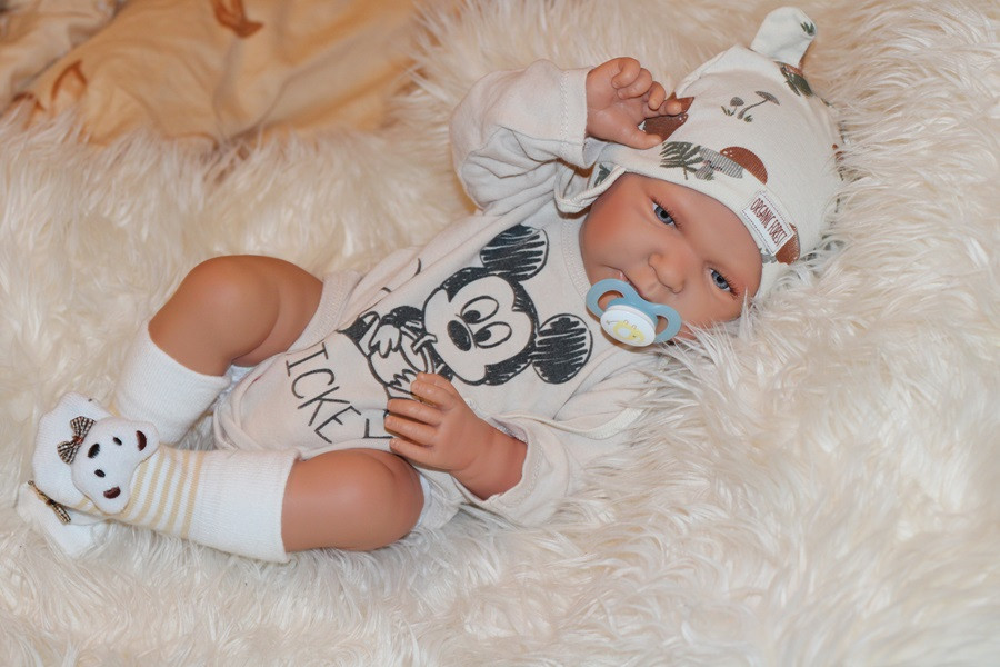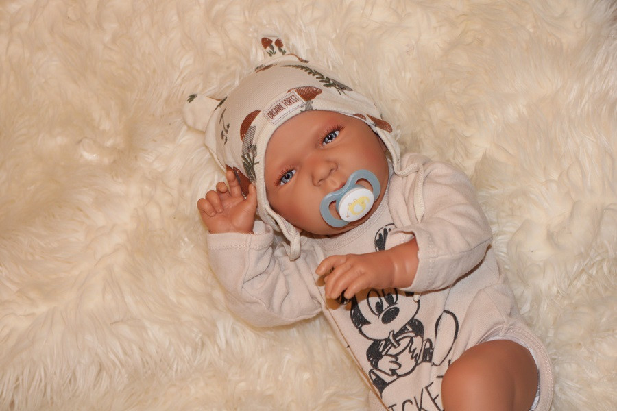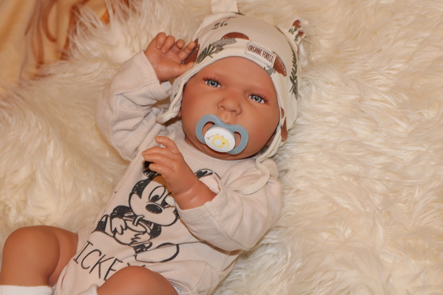 Chlapček má celé telíčko z vinylu. Vlásky nemá. Má nádherne modré očká. S hlavičkou sa dá otáčať, a ľahko sa pracuje aj s rukami a nohami. Meria 54 cm. Bábika príde aj s cumlikom.