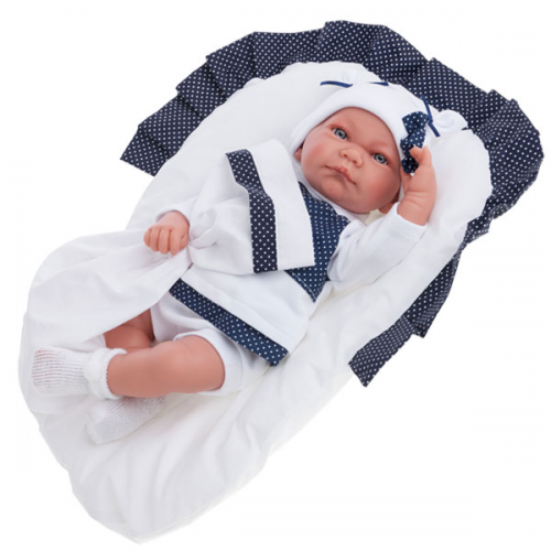 Veľmi pekná bábika. Meria 42 cm.. Telo má mäkké, látkové- vyplnené granulatmi, alebo umelým vláknom, vatou. Vlásky nemá. Končatiny má z vinylu, ktorý je príjemný na dotyk. Bábika príde v tomto peknom oblečení aj s perinkou a magnetickým cumlíkom.