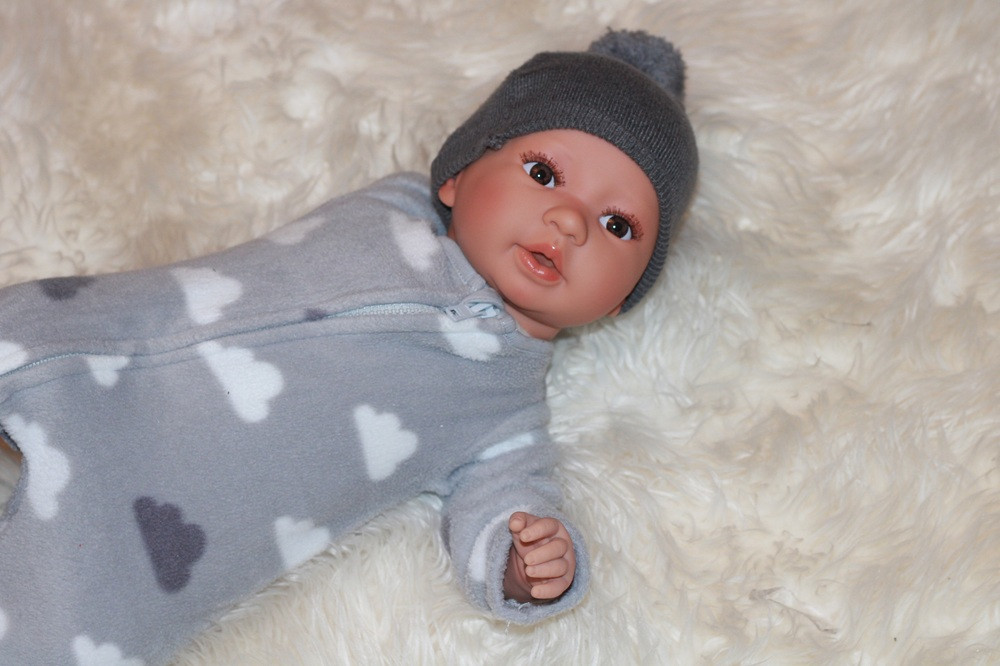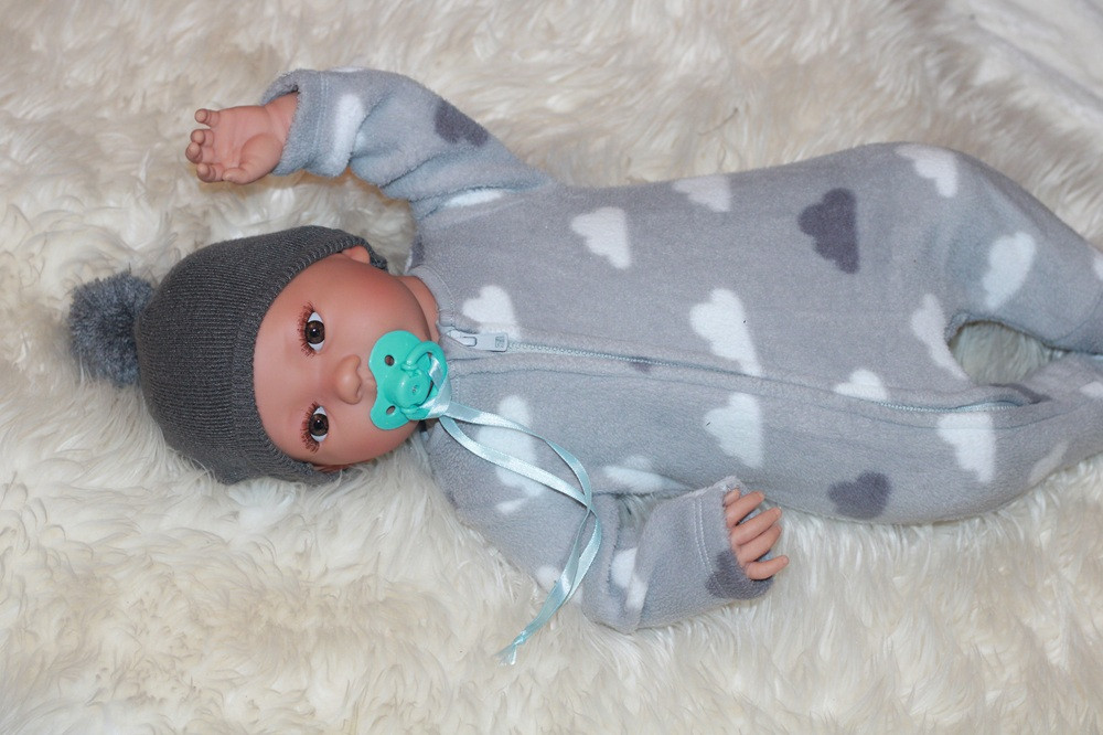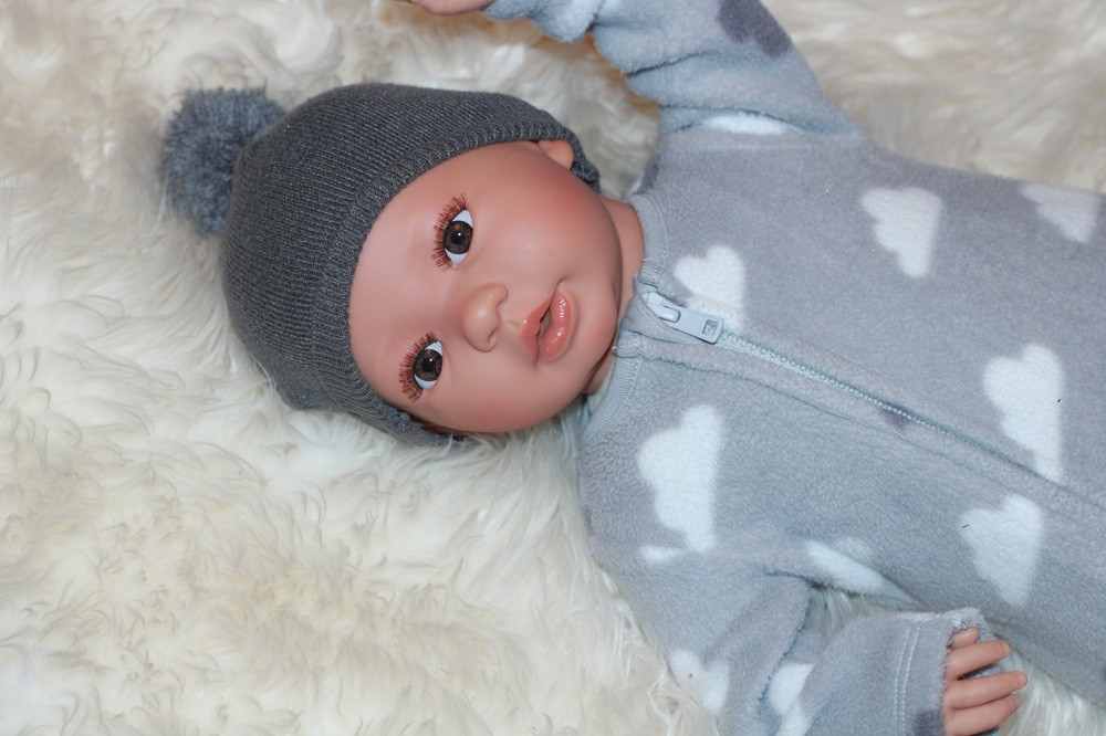 Chlapček má z látky telíčko a končatiny z vinylu. Vlásky nemá. Má nádherne hnedé očká. S hlavičkou sa dá otáčať, a ľahko sa pracuje aj s rukami a nohami. Meria 52 cm. Bábika príde aj s cumlíkom.